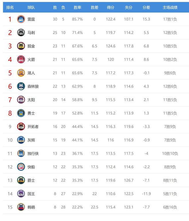 今日比赛后火箭、掘金排名互换,开拓者、灰熊排名互换,独行侠、快船、爵士排名互换,西部总计7支球队排名互换。